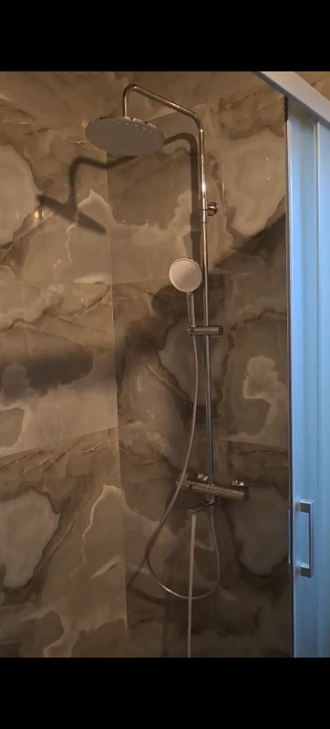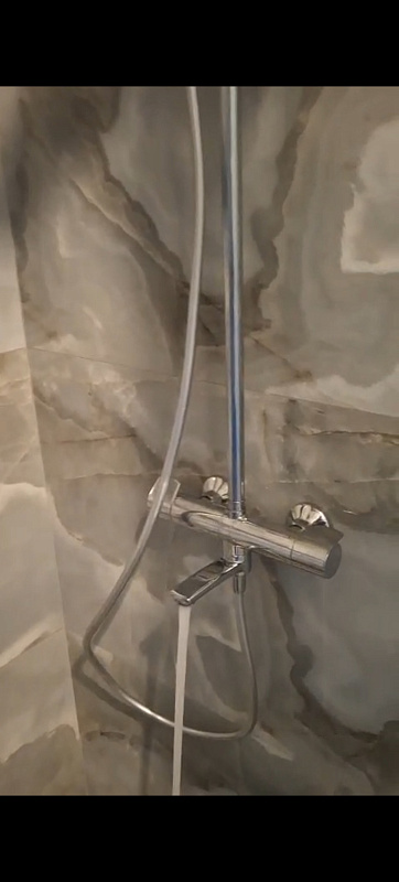 В комплектацию душевой системы входят: тропический душ, ручной душ, смеситель с термостатом и изливом, эксцентрики, держатели штанги и душа. Длина душевой штанги - 1030-1460 мм. Длина душевого шланга - 1750 мм. Размер ручного душа - 120 мм. Диаметр верхнего душа - 228 мм.